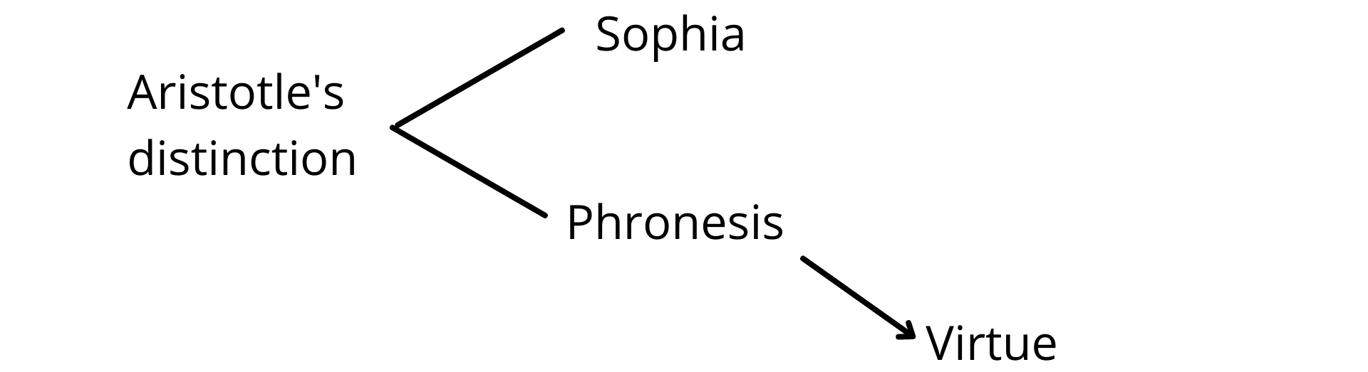 Now, this is where Schwartz and Sharpe, and this is why their book is entitled Practical Wisdom. And that's why the title of the article is Practical Wisdom because they call back to Aristotle's distinction (Fig. 5a) (writes Aristotle's distinction). This is the distinction between sophia, which is in philosophia, and phronesis (writes Sophia and Phronesis beside Aristotle's distinction). Both of these words can be translated as wisdom. This (Sophia) is often translated as theoretical wisdom and then that becomes problematic because that's often assimilated to our idea of theoretical knowledge. And then we lose a lot of what sophia is. And then Phronesis is often translated as practical wisdom.