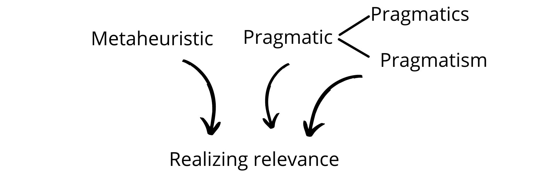 Both of those (indicates Pragmatics and Pragmatism), I think, can plausibly be brought back together in the notion [of] what we're talking about. And then, this just goes so well with the invocation of the term metaheuristic, a heuristic for managing your heuristics. We can draw this (indicates Pragmatic) together and this term together metaheuristic (Fig. 6c) (writes Metaheuristic beside Pragmatic), right. We can draw this all together with while having to do with realizing relevance (draws an arrow from Metaheuristic and Pragmatic and writes Realizing relevance below). This is invoked, not in terms of the theoretical account I've given, but the idea that zeroing in on relevant information is crucial to wisdom. This is invoked throughout the article by Baltes and Staudinger. Let's be clear. I don't think they are explicitly making a case the way I am. What I'm saying is they're invoking ideas and making use of them that ultimately deeply presuppose (indicates Realizing relevance) the ability for relevance realization.